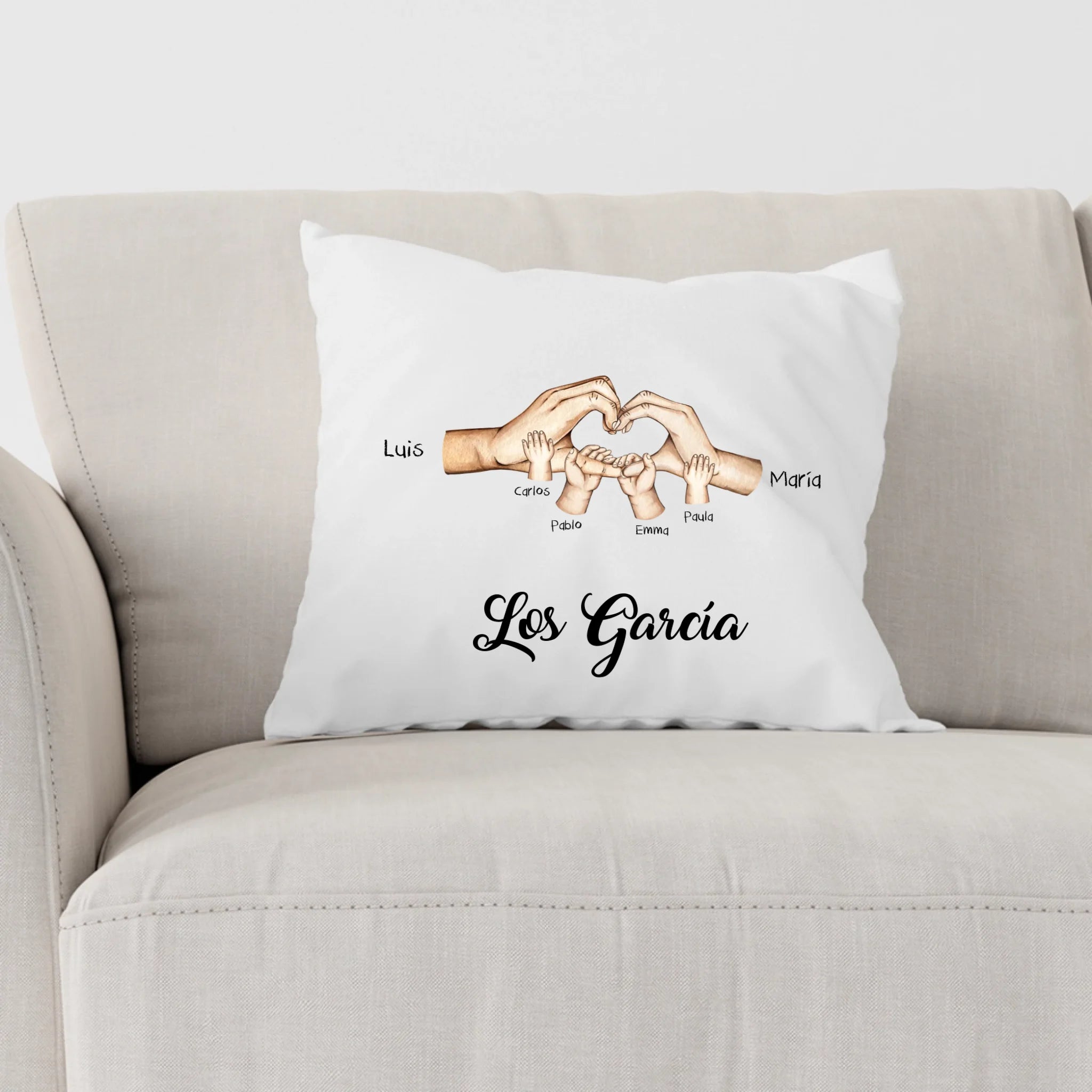 Este cojín personalizado con diseño de manos de familia está disponible en dos tamaños: 40x40 cm y 35x35 cm. Su tacto suave de algodón garantiza comodidad, mientras que la cremallera inferior facilita su lavado sin complicaciones. La funda es apta para lavadora y se personaliza con la información que nos indiques, haciendo de este cojín un detalle único y especial. Además, incluye relleno para que puedas disfrutarlo desde el primer momento. Ideal para decorar y aportar un toque personal a cualquier espacio.