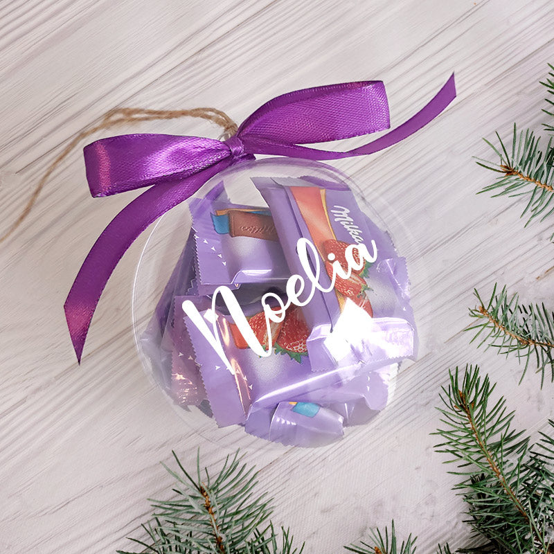 Bola de navidad personalizada y rellena de chocolate Milka - Incluye: Bola de 10cm, 16 mini chocolate milka variado, Cinta en color lila - Importante: A la hora de abrir la bola, hacerlo con cuidado.