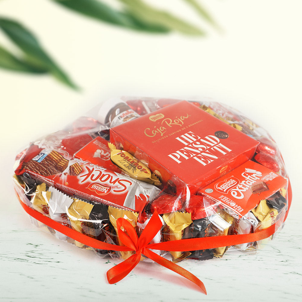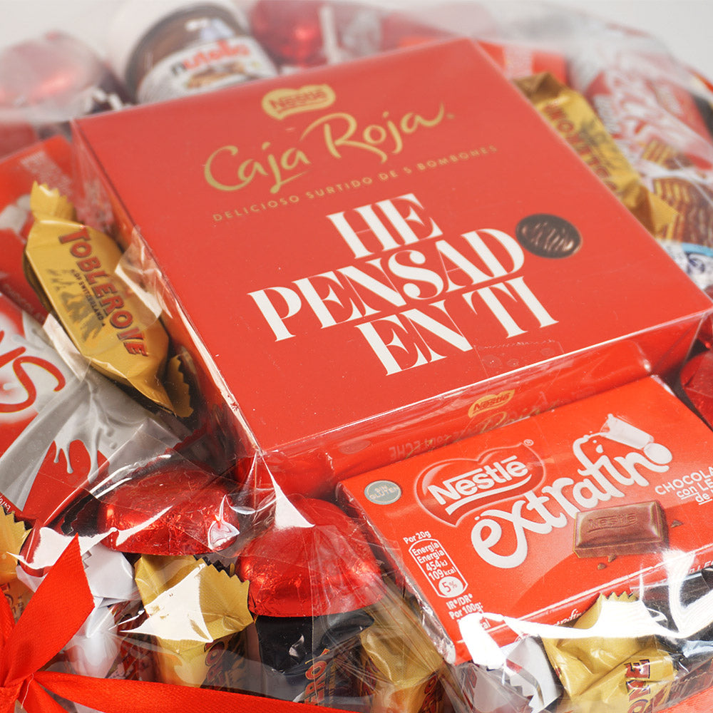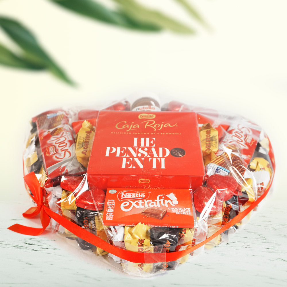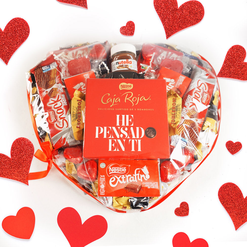 ¡Sorprende a tu persona especial con nuestro delicioso Corazón especial LOVE! Esta tarta de chocolatinas en forma de corazón está llena de una gran variedad de chocolates de marcas como Nestlé, Kinder, y Kit Kat. Hazle sentir todo tu amor con este regalo único. ¡Haz su corazón latir más fuerte con cada mordisco!