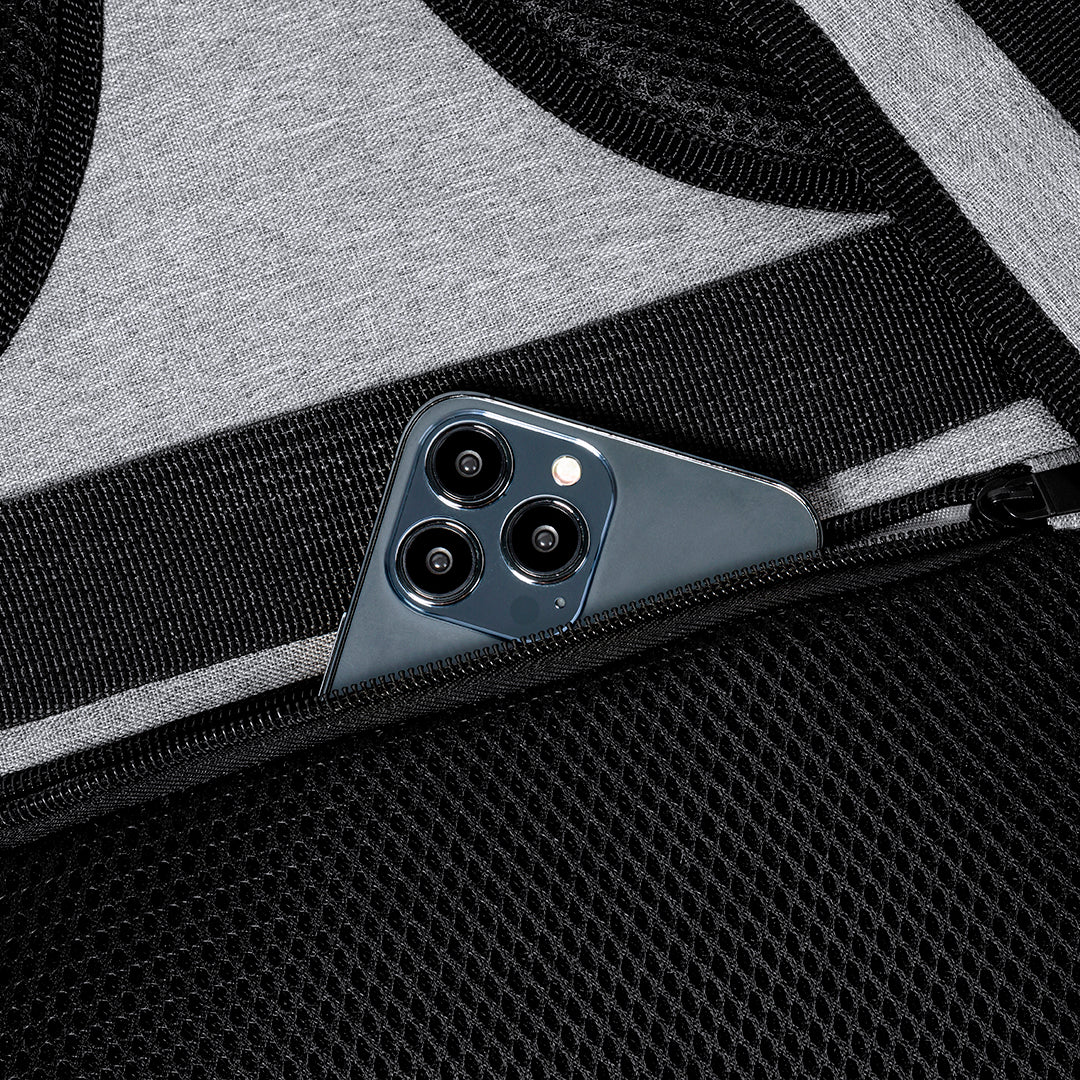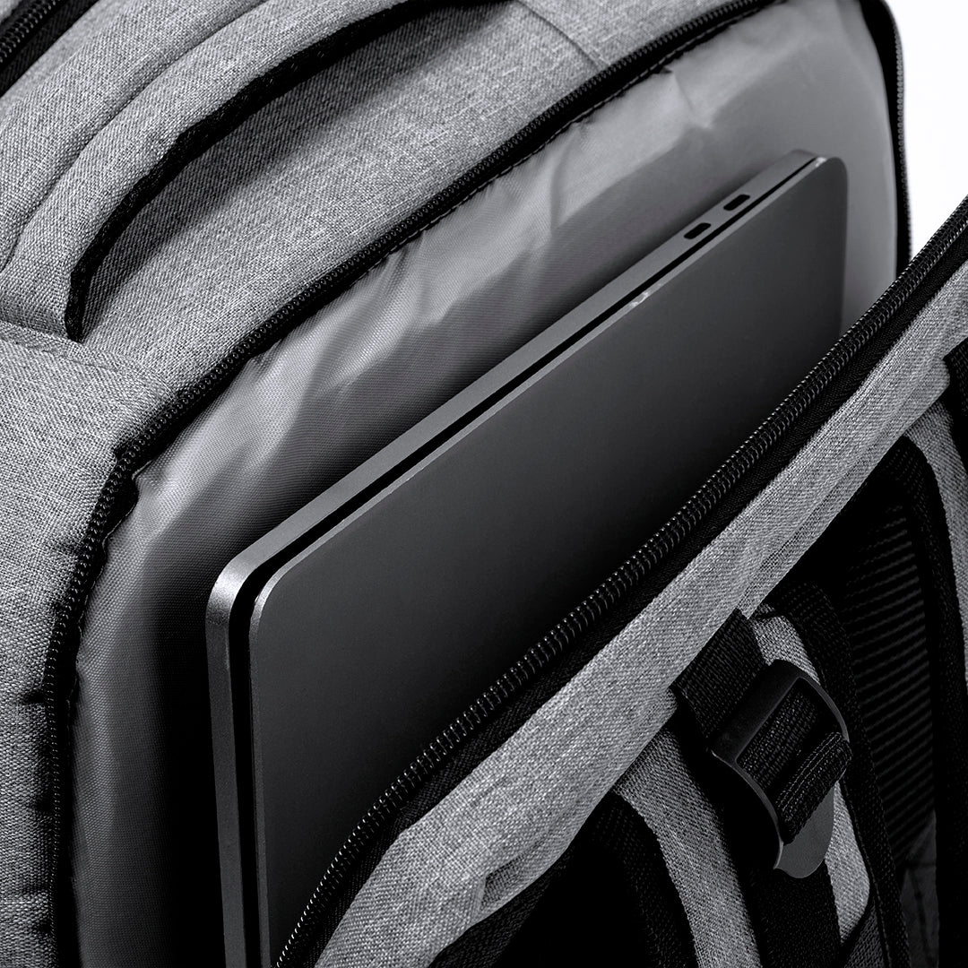 Diseñada para acompañarte durante largas jornadas, esta mochila prioriza tu confort. La zona trasera es transpirable y acolchada, facilitando la disipación del calor. Sus cintas para los hombros son anchas y también acolchadas, diseñadas específicamente para aliviar la presión y permitirte llevarla cómodamente todo el día. Además, su tejido Poliéster 300D RPET es resistente al agua, protegiendo tus pertenencias de la lluvia.