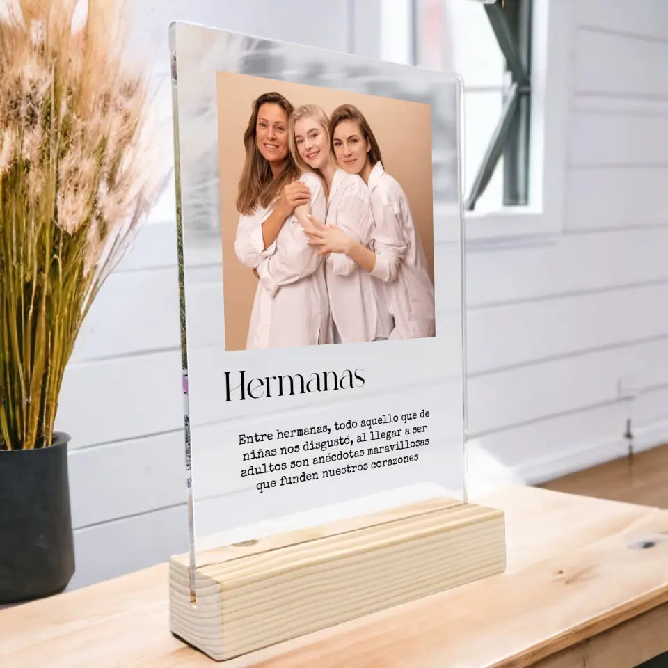 Celebra tu conexión especial con tu hermana con nuestro portafotos de metacrilato con una foto y una frase conmovedoras. Un regalo perfecto para expresar cuánto aprecias su vínculo. ¡Sorpréndela con esta pieza única y duradera!
