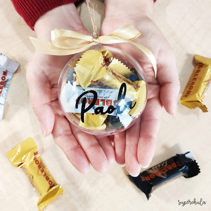 Bola de navidad personalizada y rellena de mini Toblerone - Incluye: Bola de 8cm de diámetro pvc transparente - 8 mini toblerone - Cinta en color dorado Importante: A la hora de abrir la bola, hacerlo con cuidado y siempre girando poco a poco.