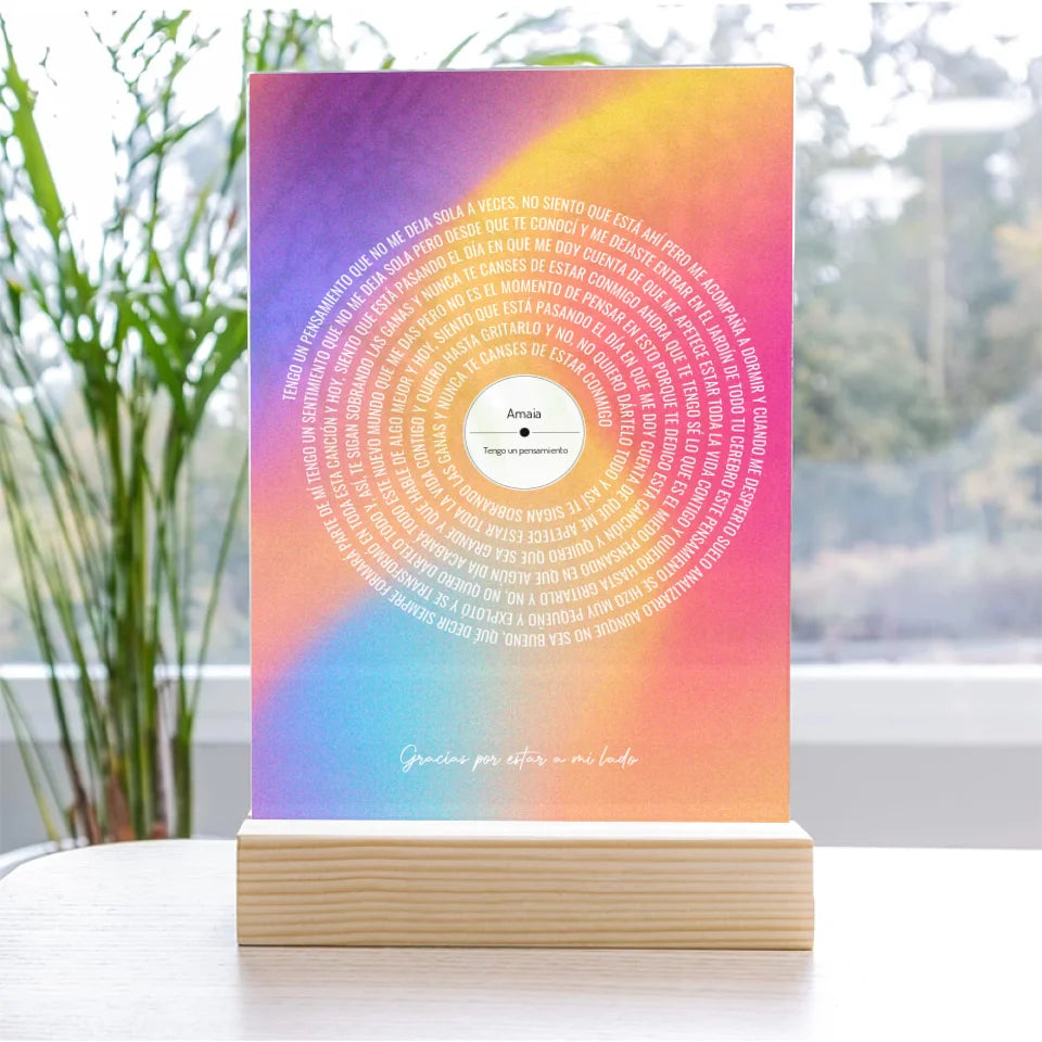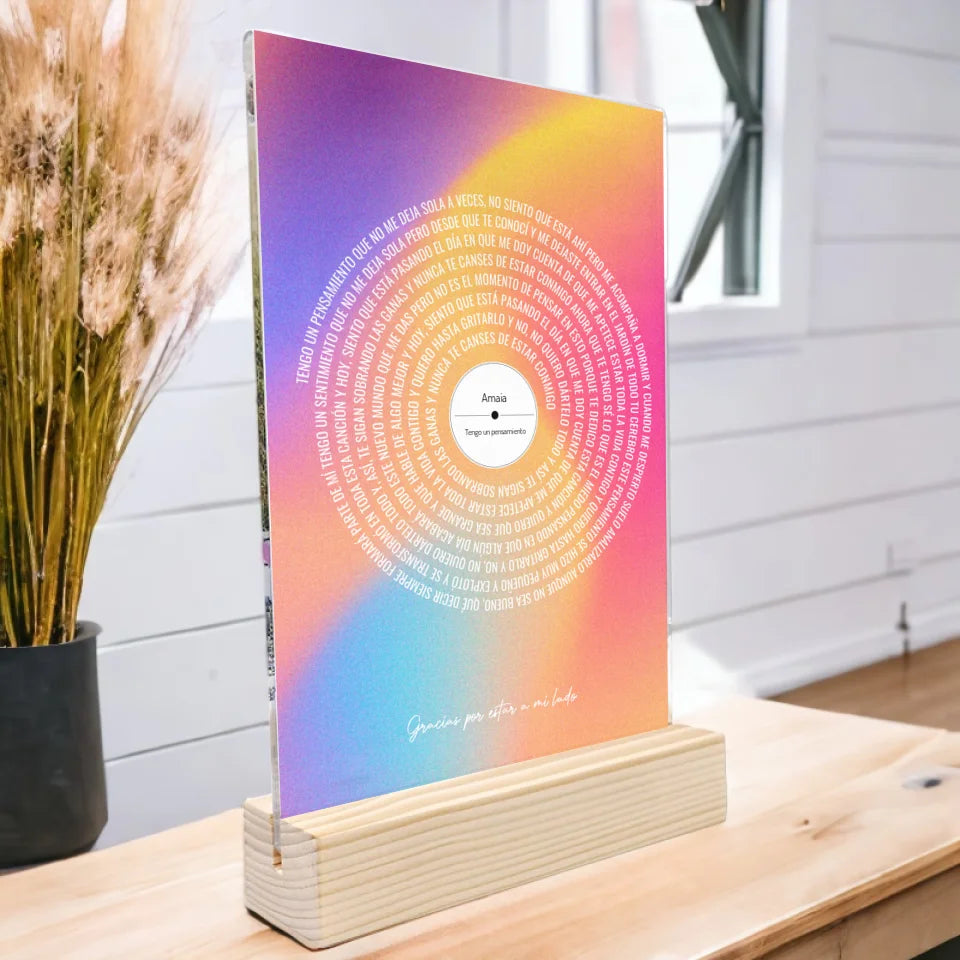 Haz que tu canción favorita cobre vida con esta placa de metacrilato personalizada. Incluye la letra de esa canción especial y elige el fondo de color que más te guste para darle un toque único. Perfecta para sorprender en cumpleaños, aniversarios o cualquier ocasión que merezca ser recordada con estilo y emoción. Un regalo moderno y lleno de significado.
