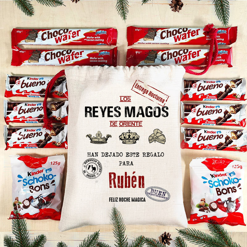• Saco Corona personalizado y lleno de chocolates variados. Kinder. 30x40cm